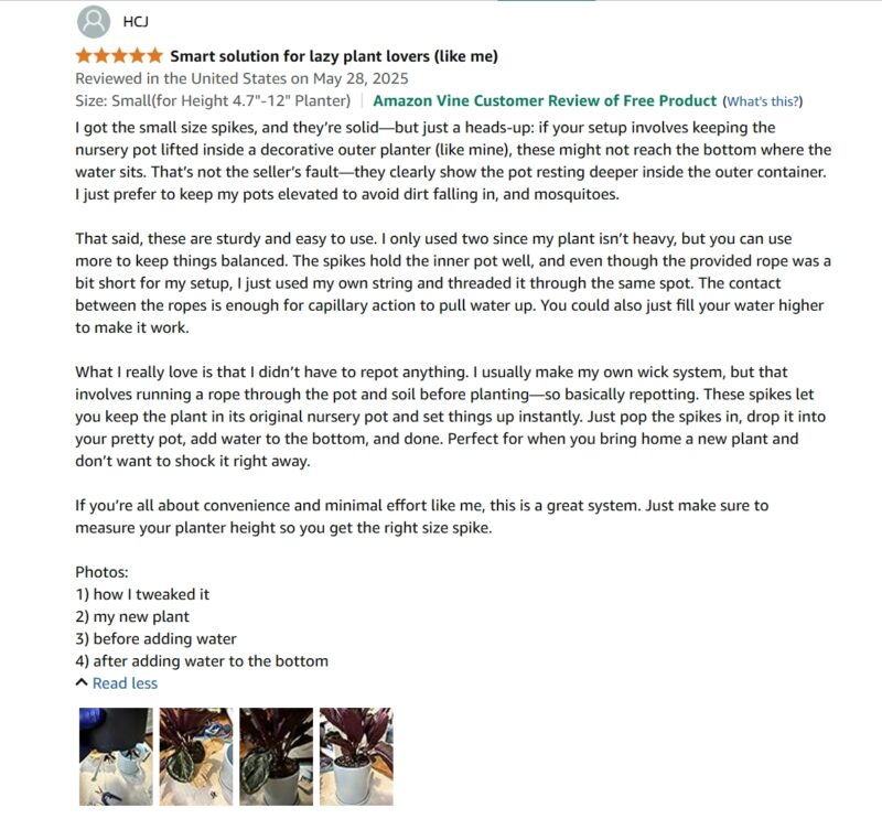 - HCJ (May 28, 2025): “Smart solution for lazy plant lovers like me… What I really love is that I didn’t have to repot anything! I usually make my own wick system, but that involves running a rope through the pot and soil before planting—so basically repotting. These spikes let you keep the plant in its original nursery pot and set things up instantly. Just pop the spikes in, drop it into your pretty pot, add water to the bottom, and done… If you’re all about convenience and minimal effort like me, this is a great system. Just make sure to measure your planter height so you get the right size spike.” HCJ’s review highlights the spikes’ biggest selling point: convenience. For those who dread the hassle of repotting, these spikes offer a quick and easy alternative—just pop them in and you’re done. HCJ also shares a practical tip about measuring planter height to ensure you choose the right size, making sure your setup works perfectly.
